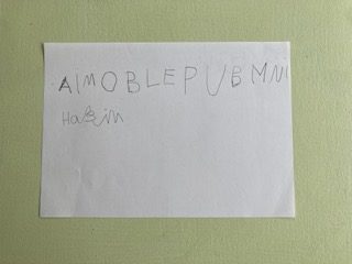 M – aujourd’hui je vais choisir le prénom d’un enfant de la classe et je vais l’écrire en faisant le bruit de ce qu’on entend. Après chaque bruit transcrit je m’arrêterai et regarderai si quelqu’un lève la main. Le premier qui trouve quel prénom je voulais écrire a gagné.