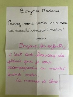 Durant un regroupement, M dit aux enfants qu’elle devra écrire aux parents pour trouver des accompagnateurs. La surprise est que la classe ira au marché avec la liste des tout ce qu’il faut pour faire le gâteau de Côme qui a 4 ans.