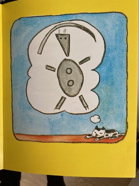 L’histoire 2 présente le chat Nono qui somnole. Ce demi-sommeil est très important car tout ce qu’il va « voir » jusqu’à son réveil en fin d’histoire, n’est qu’invention et rêve. Pour les maîtresses qui voudraient essayer de faire quelque chose de difficile mais de passionnant, on peut imaginer qu’après toutes les explications de l’histoire et des illustrations, après s’être assuré que tous les enfants ont bien saisi la pensée du chat qui voit des choses dans sa tête, elles peuvent en profiter. Par exemple, en fin de motricité, on va se reposer un peu, on s’assoit ou on s’allonge, on ferme les yeux et on dit « tiens on va faire comme Nono le chat qui essaie de penser à une souris, à qui on va essayer de penser, nous? peut-être à un gros hippopotame, allez on regarde dans sa tête ». Puis quelques minutes après, on peut dire aux enfants, « moi je n’ai pas réussi est-ce qu’il y a des enfants qui ont vu quelque chose dans leur tête? »…