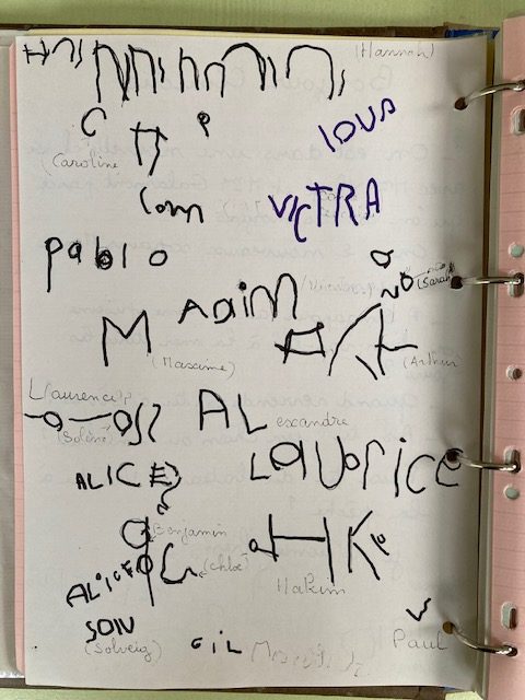 Pendant la dictée, vous savez que M demande sans arrêt aux enfants d’aller moins vite. C’est important. Parce qu’il lui faut aussi le temps de commenter le système de signes utilisé: