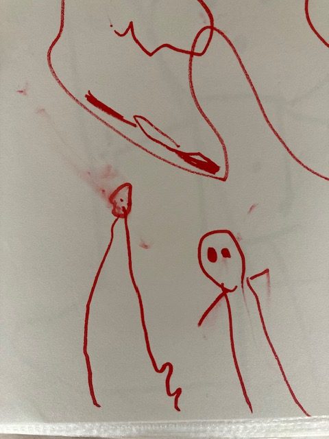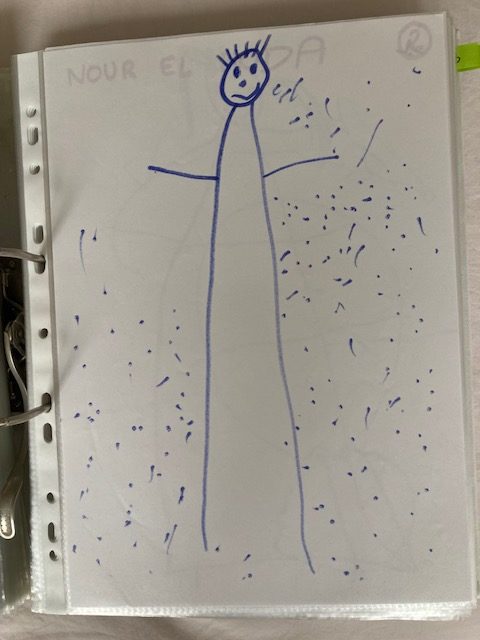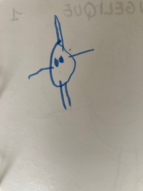Enfin, en atelier de 4 enfants, M leur redonne leurs dessins et discute avec eux sur ce qui est vraiment très bien, ce qui pourrait être encore mieux, ce qui manque. Les enfants gardent leur dessin devant eux et en fait un second en essayant de penser à ca qu’on a dit. Le but est que c’est une surprise pour l’ATSEM qu’un enfant ira chercher: elle dira ce qu’elle voit sur le deuxième dessin!!