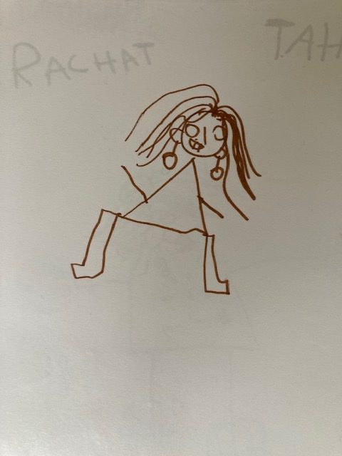 On voit que certains enfants commencent tout juste à fermer un espace (bonhomme têtard) alors que d’autres ne le font pas (bonhomme géant). Et on a même des dessins complets avec maîtrise des obliques (cheveux), de l’orientation spatiale (boucles d’oreille), du volume à la place des traits (jambes).